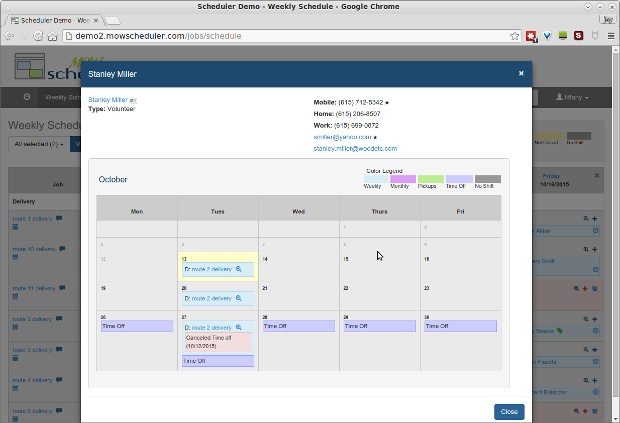 Shows a specific contact's ongoing and one-time assignments for the specified month, plus any cancellations and "time off".