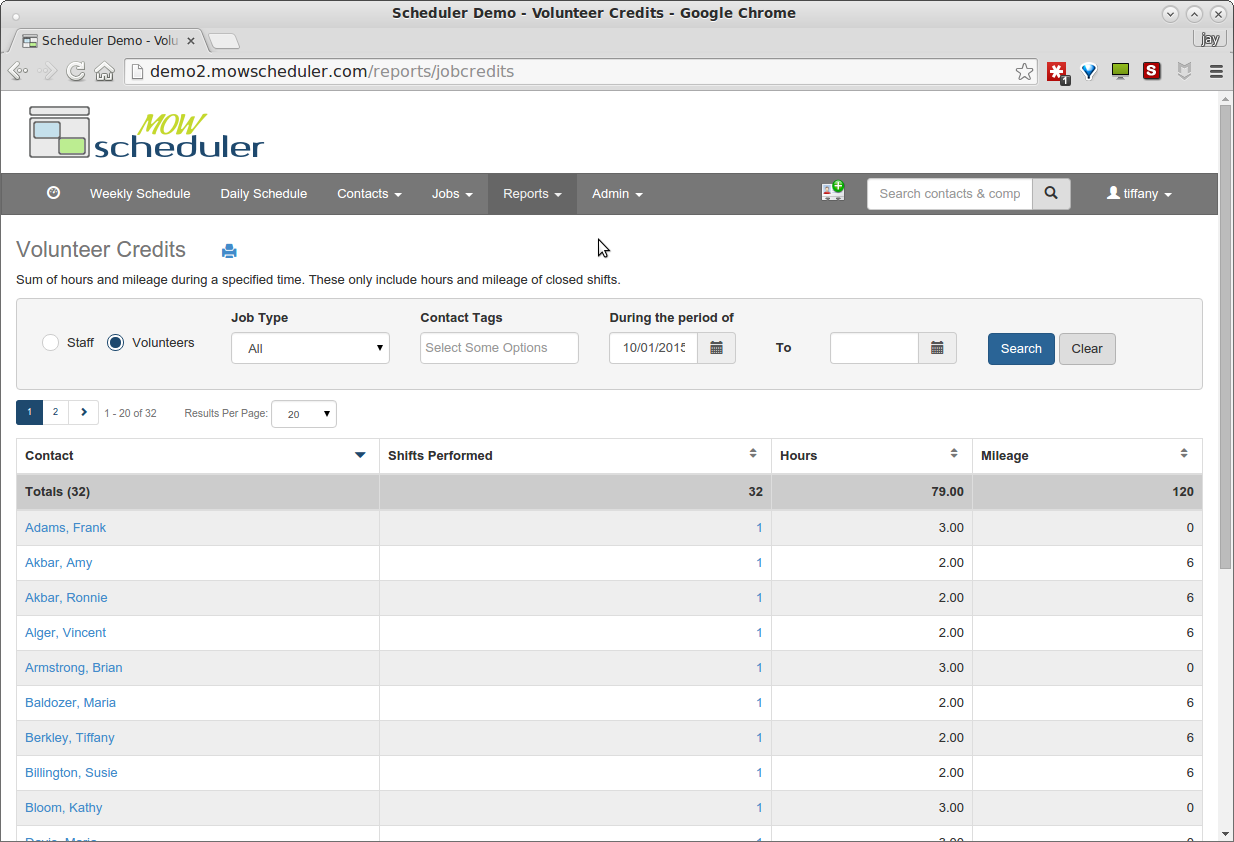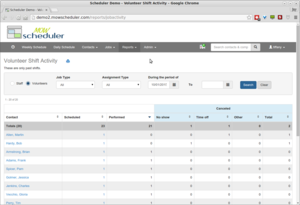 Find your top performers, problem volunteers (lots of cancels), and inactive volunteers for the specified month or year.