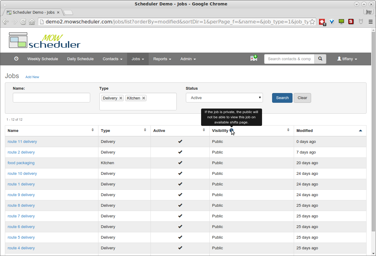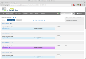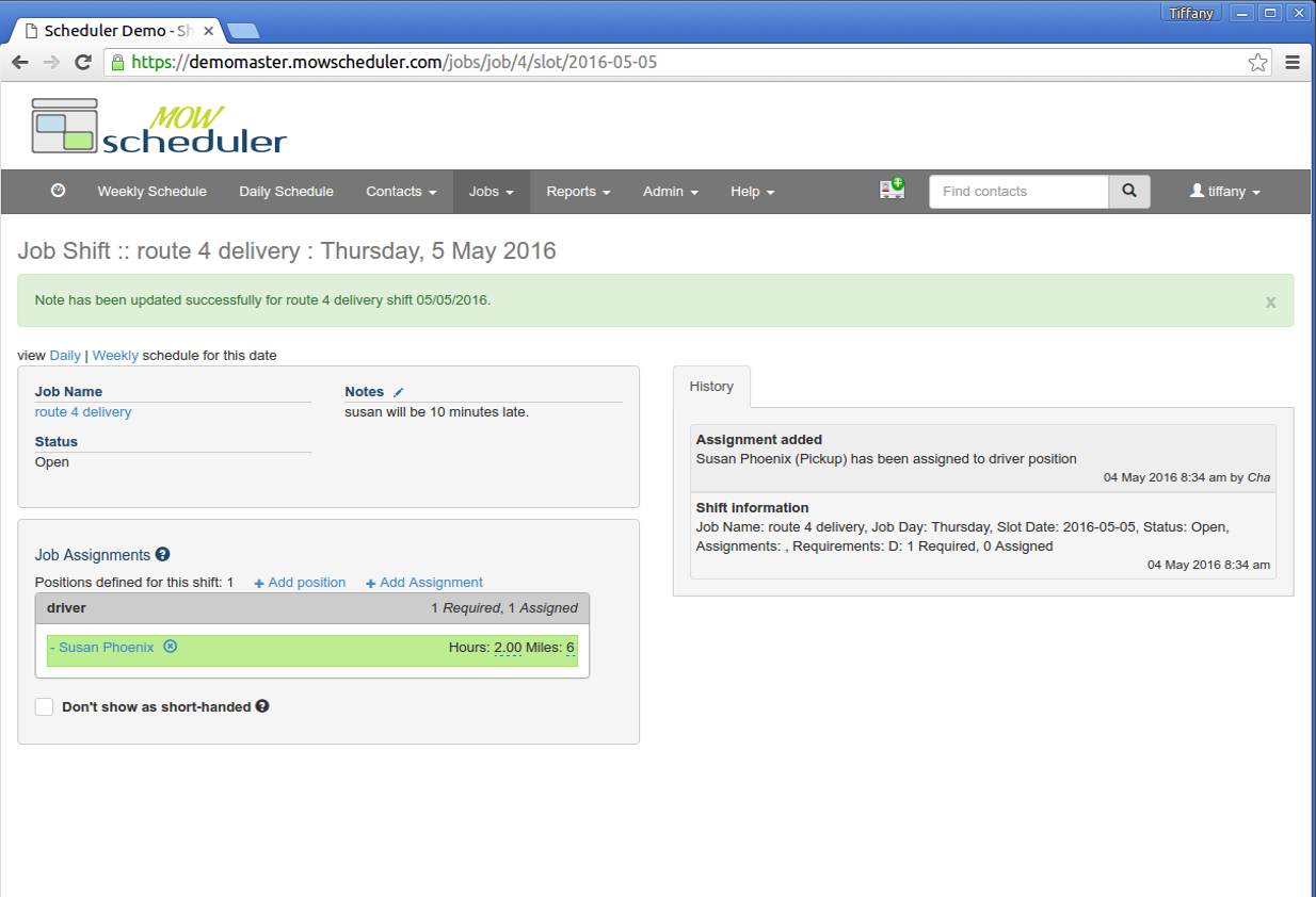Info about the job, with required positions ("need 1 driver and 2 servers") and ongoing assignments.