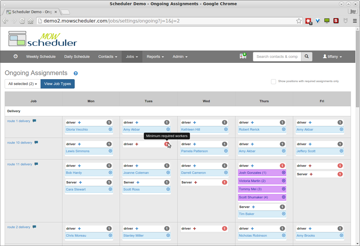 Jobs vs. days. Slots are color-coded to show assignments and openings.